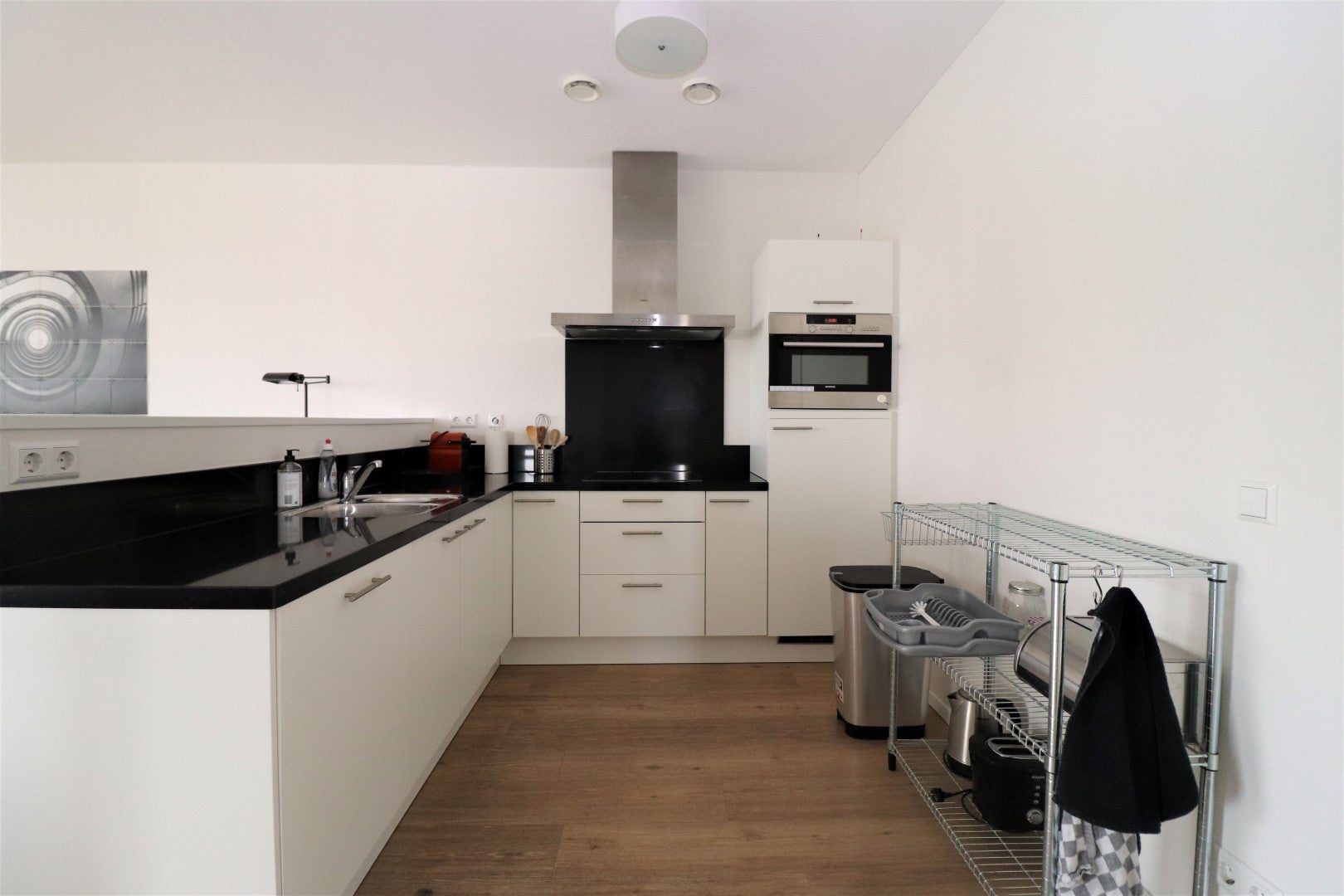 De lichte en zonnige woonkamer beschikt over grote schuifpuien die toegang geven tot het balkon op het zuiden, waardoor u de hele dag kunt genieten van veel natuurlijk licht. De halfopen keuken is volledig uitgerust met een vaatwasser, oven, magnetron, koelkast, vriezer, afzuigkap en een vierpits inductiekookplaat.